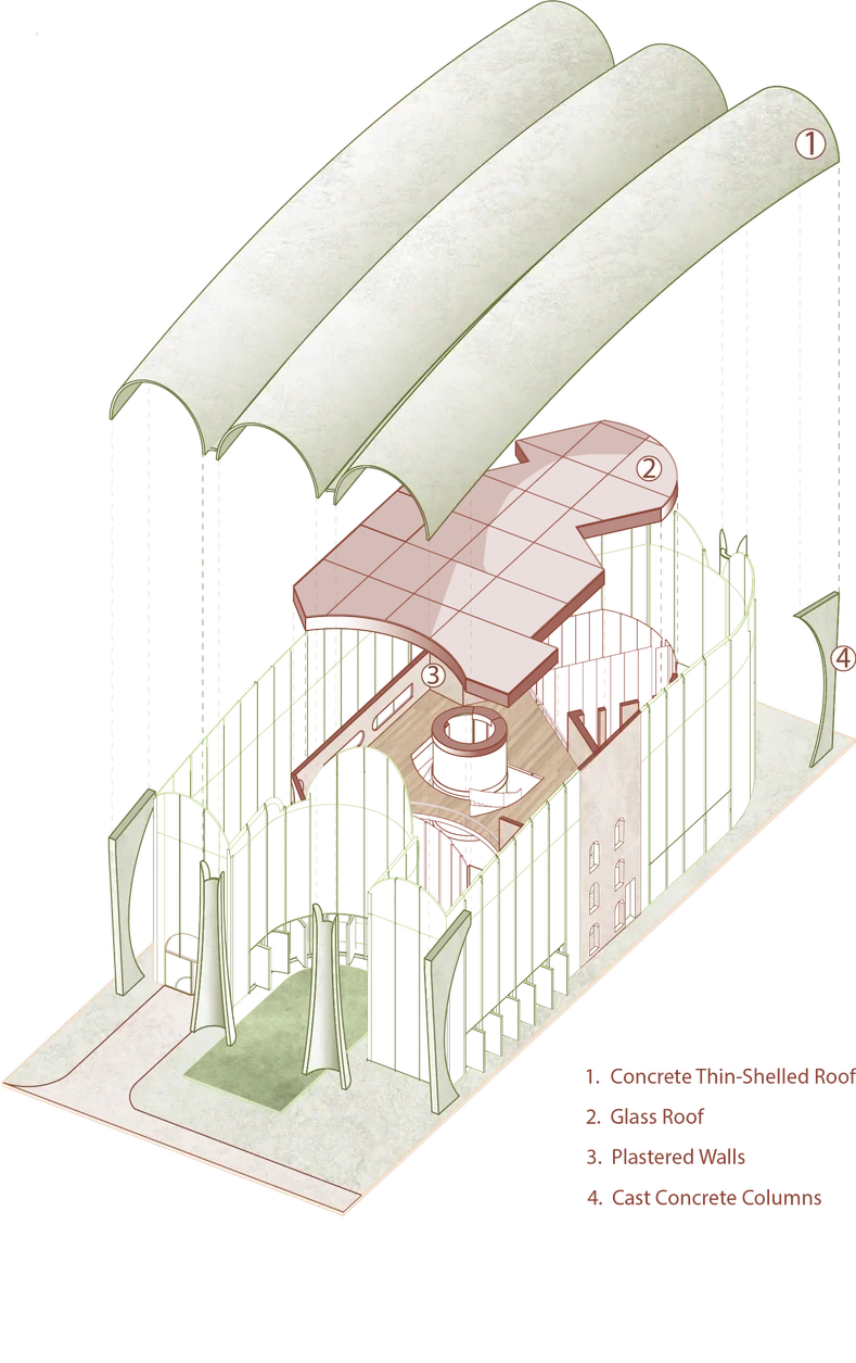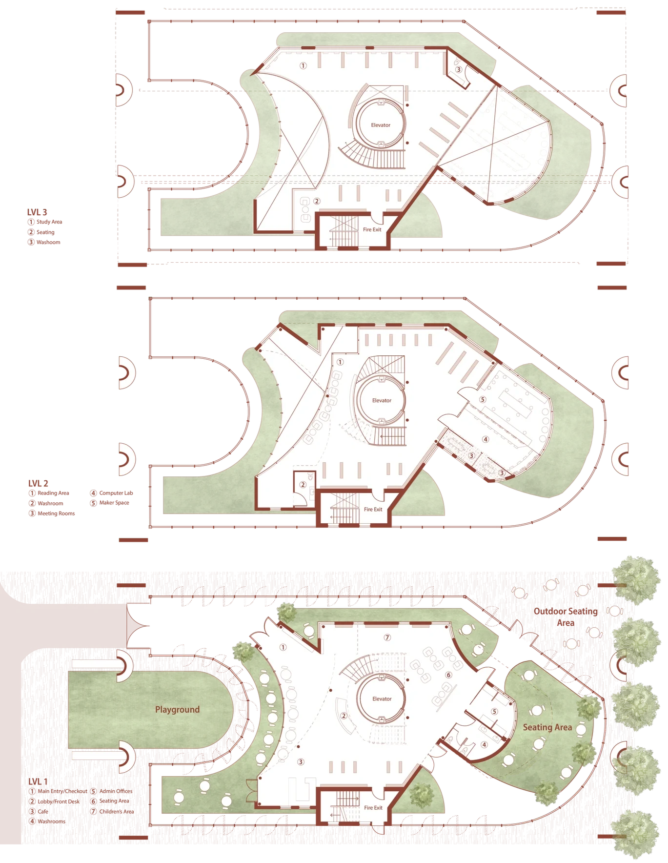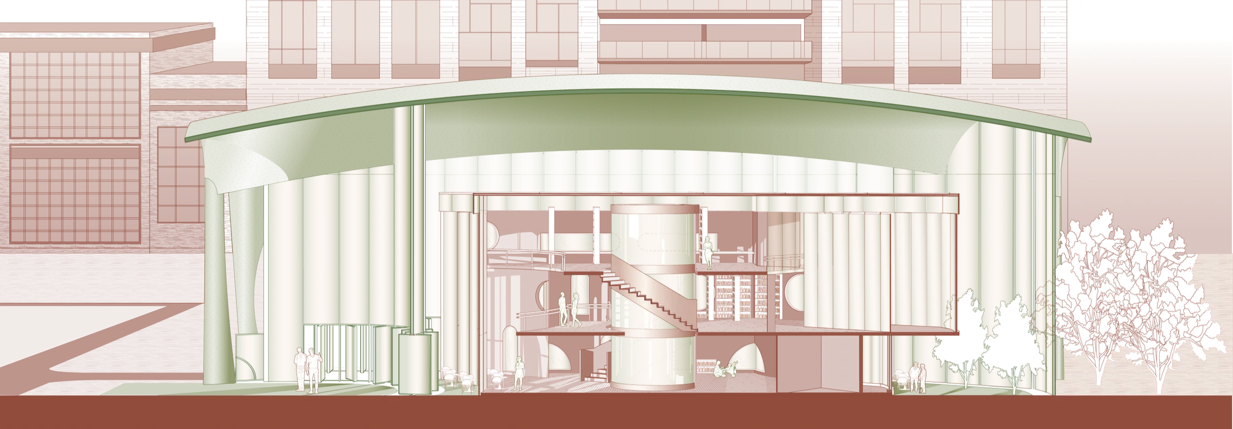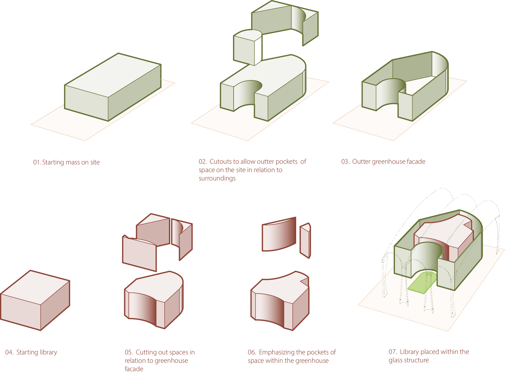 The central goal of this design is to reintegrate a pocket of urban escape amongst the sprawling industrialized landscape. It brings a pocket of nature and greenery into the brick and concrete surroundings by having the library serve as the heart within a glass exterior structure that takes inspiration from greenhouses.