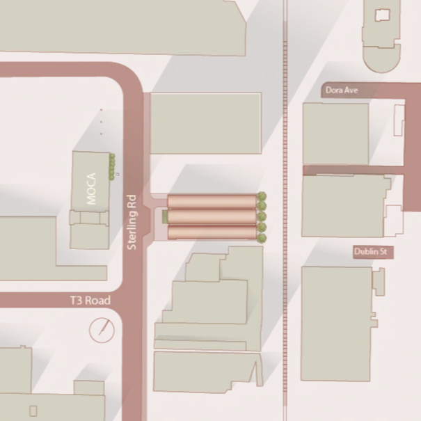 Located in the heart of Toronto, POCKETS Library is surrounded by bustling infrastructure. The front faces the MOCA (Museum of Contemporary Art) while a railway runs along the back. To keep the library as a primary pocket of urban escape on the site, trees line the back to provide separation from the fast-paced surroundings, while the front windows allow the interior space to frame the MOCA, with the library becoming a momentary museum featuring the one across its street.